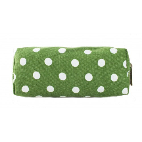 Stylish pencil case, in a green polka dot print.